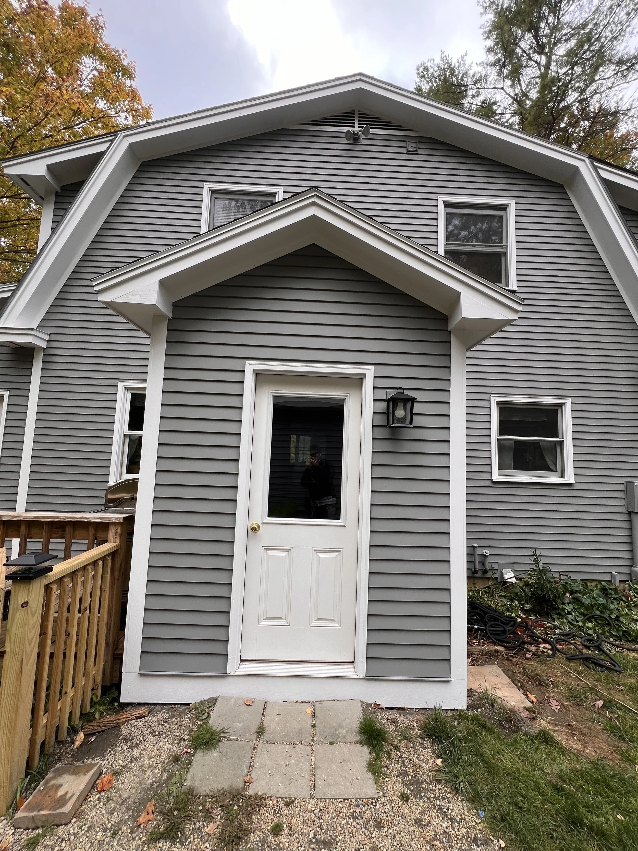 In the heart of White River Junction, Vermont, Reyes Painting & Built-ins, alongside Emanuel’s skilled team, brought a timeless blend of elegance and charm to life. The exterior design featured a sophisticated gray palette for the main surfaces, beautifully complemented by crisp white trim that added depth and definition.